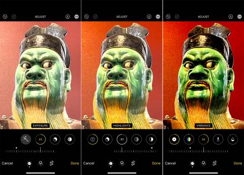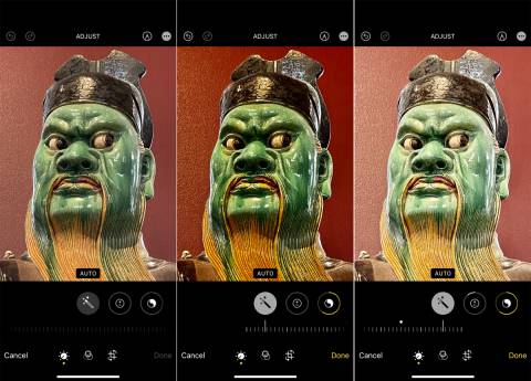 If you prefer to tweak each attribute separately, tap the appropriate icon to edit exposure, brilliance, highlights, shadows, contrast, brightness, black point, saturation, vibrancy, warmth, tint, sharpness, definition, noise reduction, and vignette. When you pick an attribute, move the slider bar left or right to make the necessary adjustments.