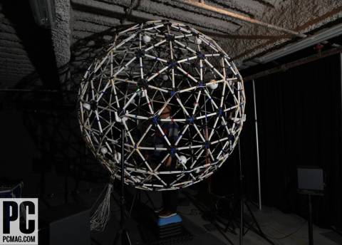 To test and further develop spatial audio technology, the lab has to be able to record and analyze sound coming from multiple directions. To do this, Qualcomm built a testing sphere. The geodesic ball is large enough for a person to fit inside and is equipped with 25 speakers pointing at the center from multiple directions. An engineer (or a HATS) can be placed in the middle of the sphere to receive the multidirectional audio signals and gauge performance.