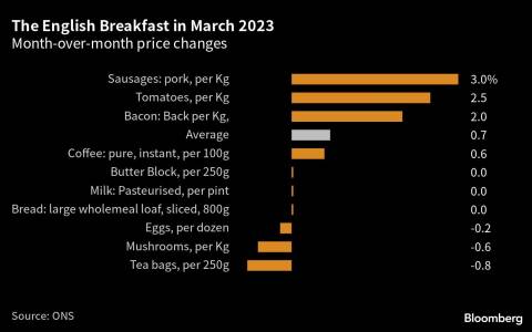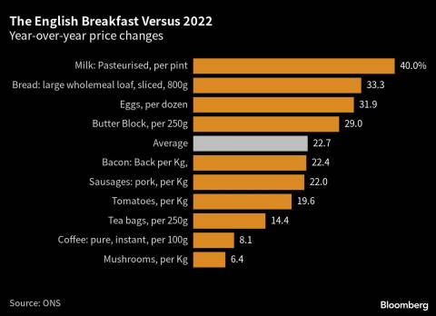 The average cost of ingredients to make a traditional fry-up soared almost 23% from a year earlier in March. It’s the biggest increase since Bloomberg started the Breakfast Index in June and reflects Britain’s struggle to curb the steep rise in food prices.