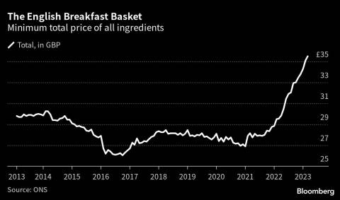(Bloomberg) -- The price of a full English breakfast jumped to a new high as stubborn food price inflation makes life harder for British consumers.