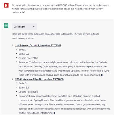 People can use the Redfin ChatGPT plugin to describe their ideal home and neighborhood in everyday terms and find listings that suit their needs. For example, “I'm moving to Houston for a new job with a $150,000 salary. Show me three-bedroom homes for sale with private outdoor entertaining space in neighborhoods with trendy restaurants.” The Redfin ChatGPT plugin will answer with a list of homes that fit the bill. Users can click the links to the Redfin.com listing pages, where they can book an on-demand tour with an experienced, local Redfin agent.