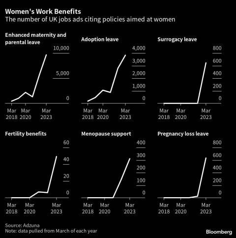 Jobs advertising time off for a lost pregnancy rocketed almost 3,000% from a year ago in March, while posts citing fertility benefits such as egg freezing and IVF treatment soared over 700%, according to data provided to Bloomberg by the job site Adzuna. Those citing menopause leave doubled.