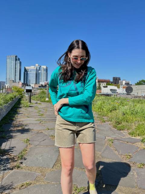 “It’s the year of the moss, olive, light green… or it is for me. Lately, I’ve been channeling gardeners, hikers, and camo chic, and these Frame stoned moss super high cut-offs fit the bill. I’m getting a little tired of my basic blues, gray, and black jean washes, and was compelled by this soft green denim to change up my wardrobe. They’re a wash you don’t see often when cut-off shopping (at least not in my corner of the internet or in Brooklyn vintage shops). This particular style pairs well with most of my tops and is buttery soft and forgiving without looking lazy. And the finished raw hem doesn’t give “I made these myself” in a good way (we’ve all been there). I dressed it down with a casual outfit but I can see myself styling it with a black tank and an oversized leather jacket or boots for an evening out. It still follows the millennial fit for my young millennial lifestyle without looking dated— I see this being a classic piece for my summer rotation.” — Clare Palo, Senior Strategist, Audience Development