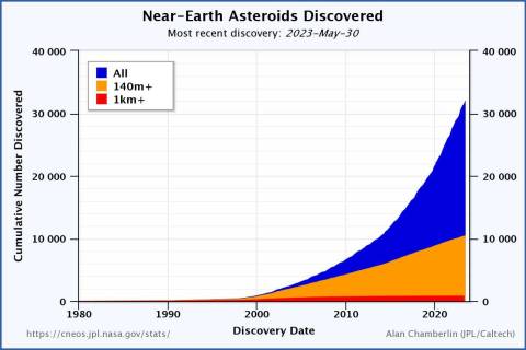 Astronomers have found nearly 10,000 nearby space rocks (nearby often means many millions of miles away) that span over 460 feet across, as of May 2023, with some 500 more such objects sleuthed from the dark skies each year. These have the potential to cause vast regional destruction, and an estimated 15,000 remain undiscovered. Fortunately, over 90 percent of the largest behemoths — over a half-mile across — have been found.